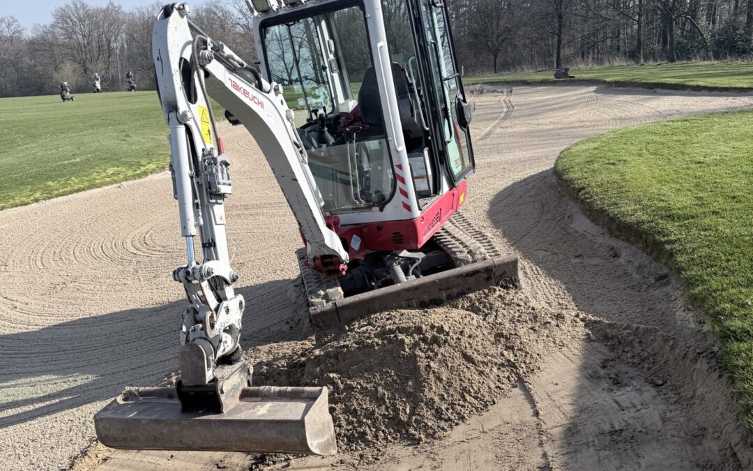 Nachdem im letzten Jahr bei 17 Bunkern neue Drainagen gelegt und der Sand ausgetauscht wurde, geht es dieses Jahr weiter. Begonnen wurde mit dem Bunker am Grün der 5, dessen Kante auch komplett abgetreten war. Während der Arbeiten ist das Grün gesperrt und die Fahne steckt auf Winterposition.